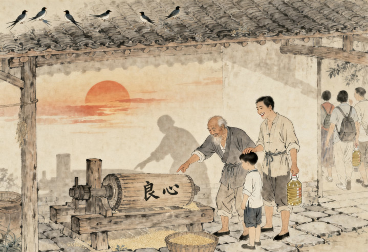 老周摸了摸小朋友的头,指着木榨上的 “良心” 二字,笑着说:“因为这油坊里有良心啊。做人要讲良心,做事也要讲良心,守住了良心,就守住了咱们的根。”