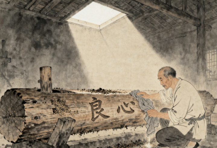 油坊里暗,只有屋顶开了个四方的亮窗,光斜斜地漏下来,照在那台比老周还大的木榨上。木榨是硬松木做的,纹路里嵌着经年的菜籽壳,一敲就掉些碎渣,却透着股子陈香。老周蹲下来,用布擦木榨上的 “良心” 二字 —— 那是他爹刻的,刻得深,几十年过去,笔画里还能摸到凹凸。