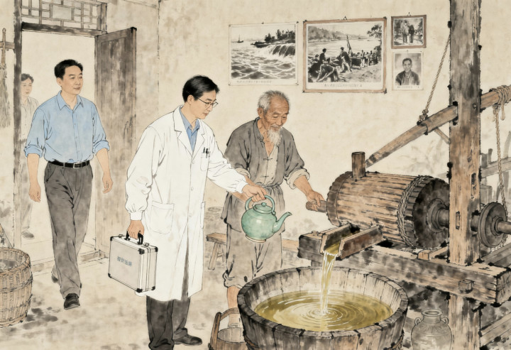 这事还没结束。过了两天,城里来了个穿白大褂的人,是食品监督局的李专家,他是老周的儿子周明请来的。周明听说村里要拆油坊,还跟父亲闹了矛盾,心里不放心,就请李专家来看看父亲的油到底有没有问题。